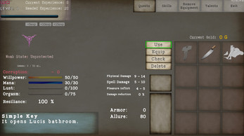 Interact with and use objects, gather different weapons and clothing, solve riddles, and explore the strange, lewd world.